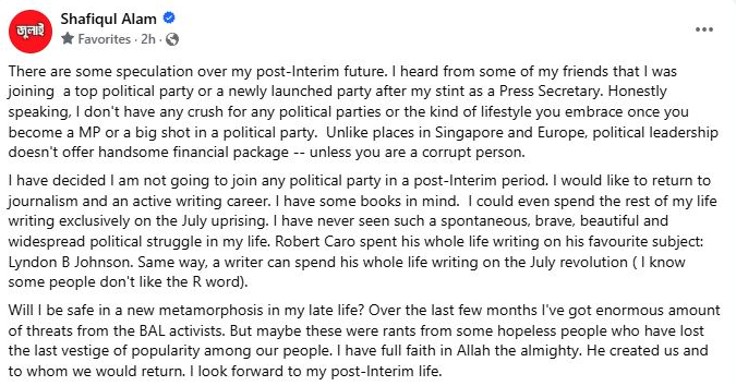 এরই ধারাবাহিকতায় বুধবার (২ জুলাই) সকালে নিজের ভেরিফায়েড ফেসবুক অ্যাকাউন্টে একটি পোস্ট দেন প্রেস সচিব। সেখানে তিনি জানিয়েছেন, অন্তর্বর্তী সরকারের পরবর্তীতে কোনো রাজনৈতিক দলে তিনি যোগ দেবেন না, বরং সাংবাদিকতা ও লেখালেখির জীবনেই ফিরে যেতে চান।