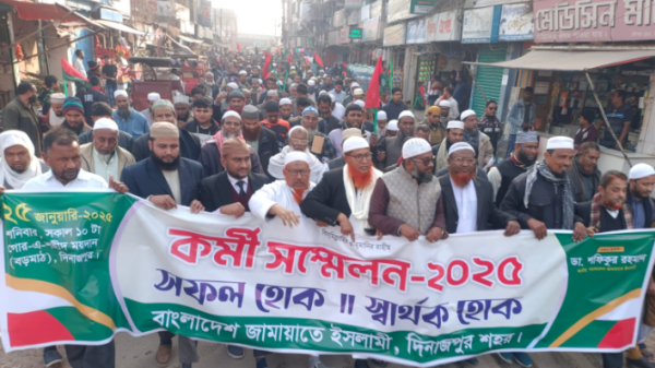 দিনাজপুরে আগামী ২৫ জানুয়ারির কর্মী সম্মেলন সফল করার লক্ষ্যে শহর জামায়াতের উদ্যোগে মিছিল মিছিল অনুষ্ঠিত হয়েছে। ১৫ জানুয়ারি বুধবার বিকেলরেলওয়ে স্টেশন চত্বর থেকে বাংলাদেশ জামায়াতে ইসলামী দিনাজপুর শহর শাখার আমীর