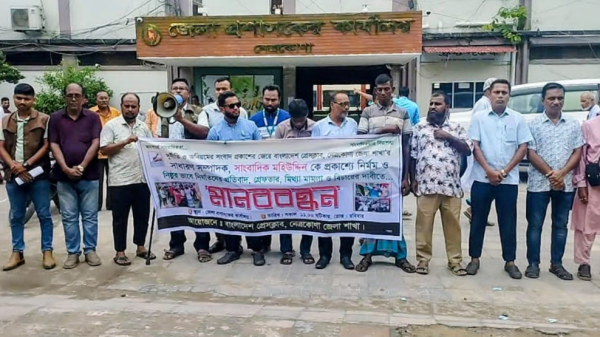 বাংলাদেশ প্রেস ক্লাব নেত্রকোনা জেলা শাখার সাধারণ সম্পাদক সাংবাদিক মহিউদ্দিনের উপর হামলার প্রতিবাদে রবিবার (৫ অক্টোবর) সকালে নেত্রকোণায় এক মানববন্ধন অনুষ্ঠিত হয়েছে। বাংলাদেশ প্রেস ক্লাব নেত্রকোণা জেলা শাখার আয়োজনে জেলা